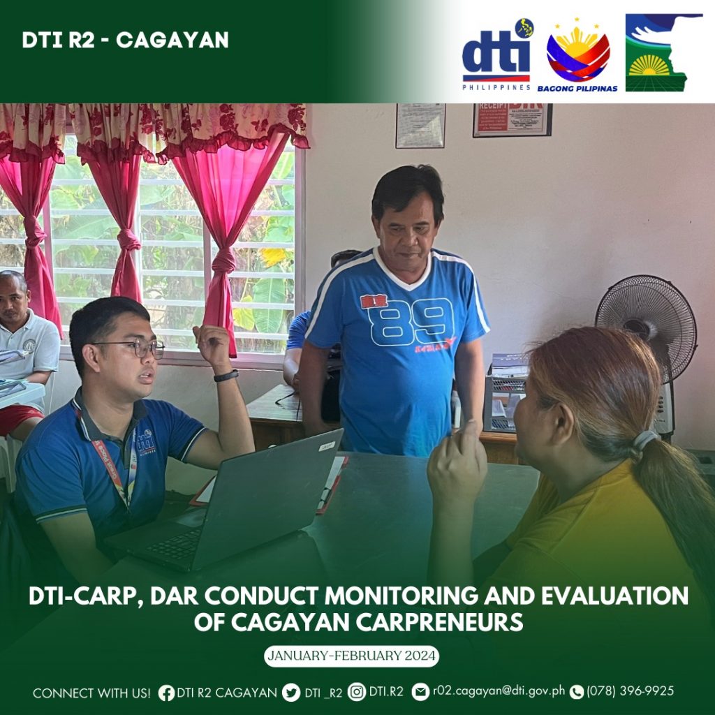 The Department of Trade and Industry Cagayan Provincial Office through its Comprehensive Agrarian Reform Program (DTI-CARP) in collaboration with the Department of Agrarian Reform (DAR) conducted a series of monitoring to Agrarian Reform Beneficiary Organizations (ARBOs) in the province on January-February 2024. The activity aims to assess the implementation of CARP Projects of DTI and DAR to the ARBOs.