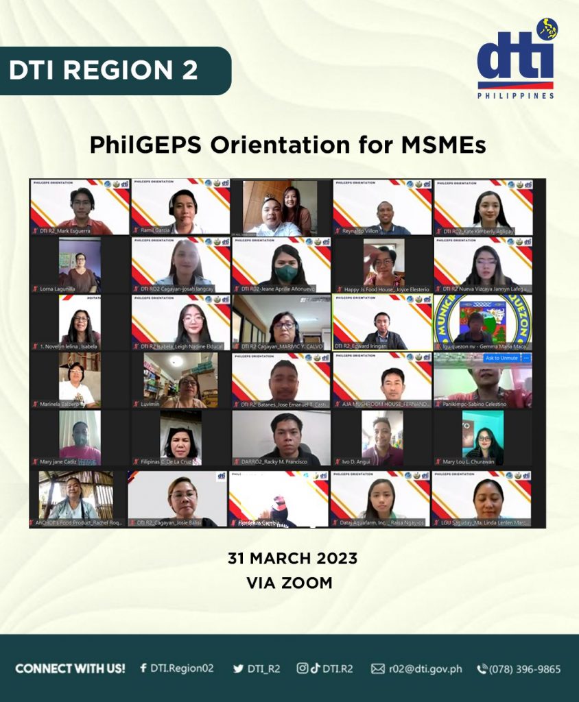 To help MSMEs expand their market access through Business to Government (B2G) transactions, the Department of Trade and Industry Region 2 conducted an orientation on the Philippines Government Electronic Procurement System (PhilGEPS) for the MSMEs in the region, held via Zoom on March 31, 2023.