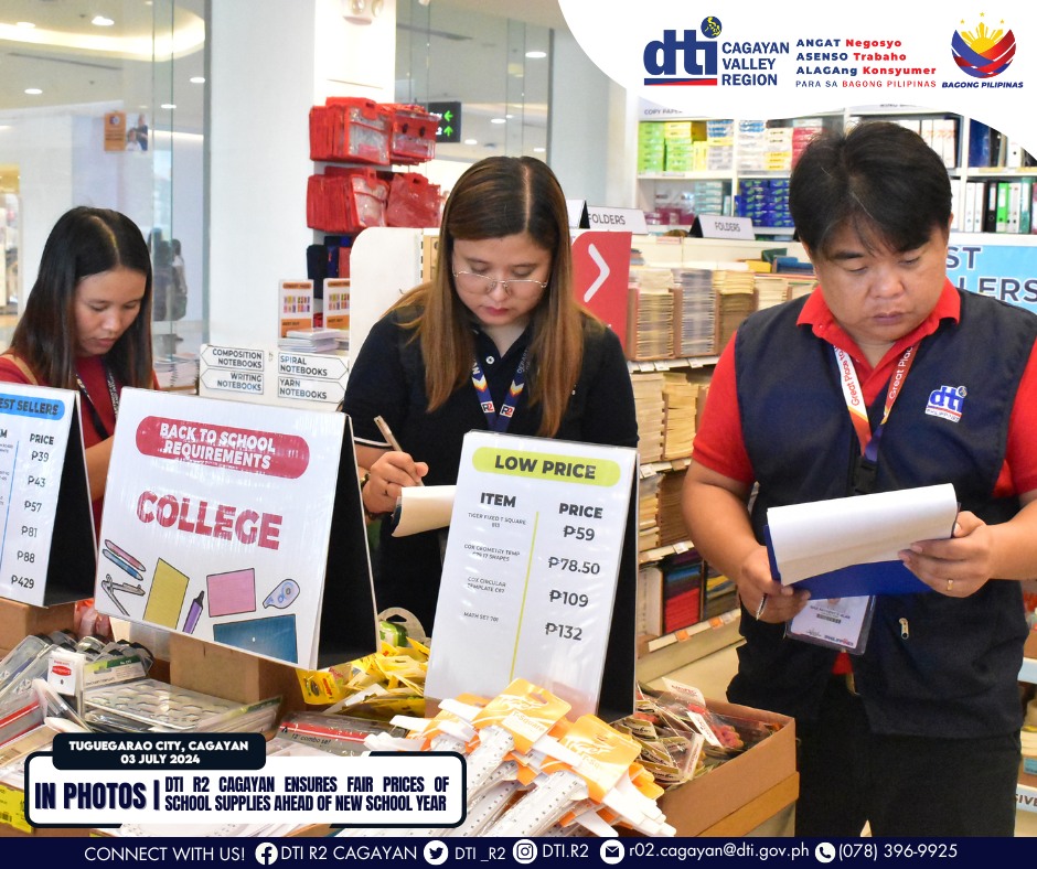 Tuguegarao City, Cagayan — The Department of Trade and Industry (DTI) Cagayan, through its Consumer Protection Division led by CPD Chief Lourdito B. Antonio, conducted a price monitoring initiative for school supplies along Tuguegarao City, Cagayan on 3 July 2024.
