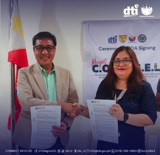 Regional Director Ma. Sofia G. Narag, CESO V and Campus Executive Officer Engr. Roger P. Rumpon, representing the Department of Trade and Industry (DTI) Region 2 and Cagayan State University (CSU) Carig Campus, respectively, signed the Memorandum of Agreement during the launching of the “Project C.O.U.N.S.E.L.: Consumer Outreach for Unassisted Parties through a Network of Student Practitioners for Effective Legal Representation” on 29 August 2024 at the DTI R2 Negosyo Center, Carig Sur, Tuguegarao City.