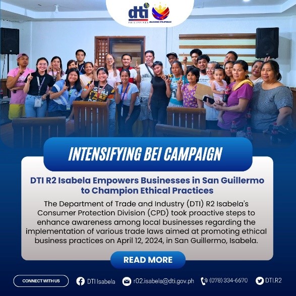 The Department of Trade and Industry (DTI) R2 Isabela’s Consumer Protection Division (CPD) took proactive steps to enhance awareness among local businesses regarding the implementation of various trade laws aimed at promoting ethical business practices on April 12, 2024, in San Guillermo, Isabela.