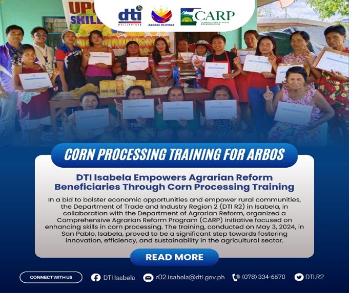 SAN PABLO, ISABELA — In a bid to bolster economic opportunities and empower rural communities, the Department of Trade and Industry Region 2-Isabela in partnership with the Department of Agrarian Reform, organized a Comprehensive Agrarian Reform Program (CARP) initiative focused on enhancing skills in corn processing. Held on May 03, the training proved to be a significant step towards fostering innovation, efficiency, and sustainability in the agricultural sector.