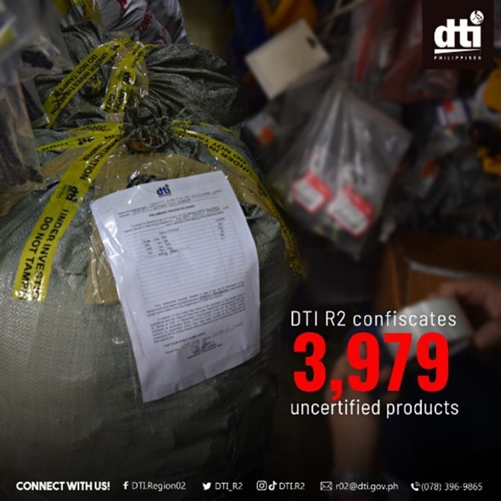 DTI R2 confiscated 3,979 uncertified goods worth Php 291,183.00 in Santiago City, Echague, Alicia, and Cauayan City during the regional enforcement conducted on 28–30 June 2022.