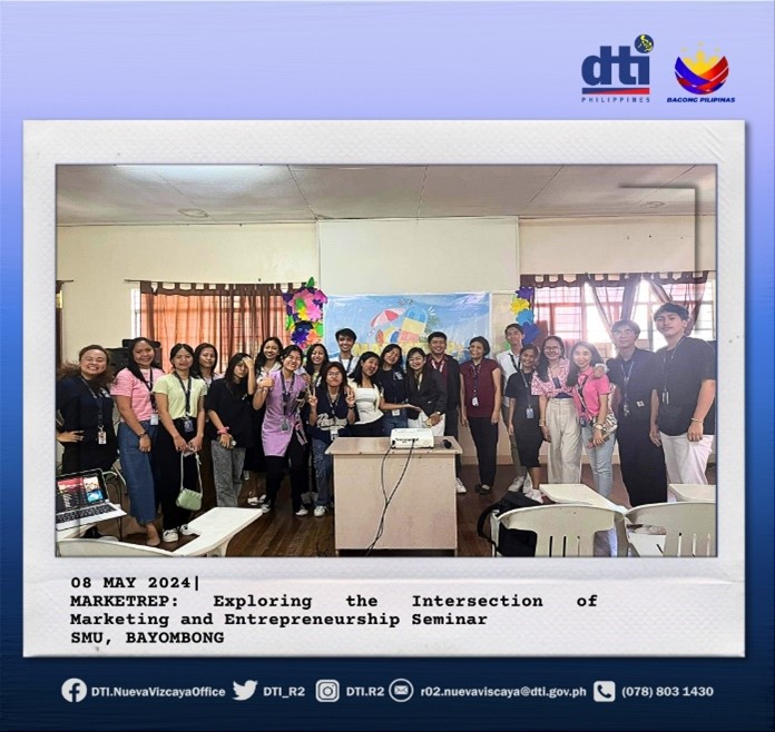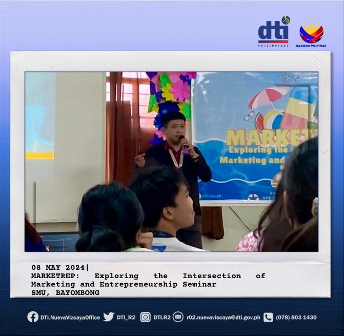 “Stand out and do business! The DTI will be with you every step of the way as you start diving into the world of marketing and entrepreneurship,” DTI R2 Nueva Vizcaya representative TIDS Silvester Miguel said as he delivered a lecture on the Best Practices of MSMEs in Marketing their Products and DTI’s related programs and services during the MARKETREP: Exploring the Intersection of Marketing and Entrepreneurship Seminar of the Junior Marketing Association of Saint Mary’s University on 8 May 2024.
