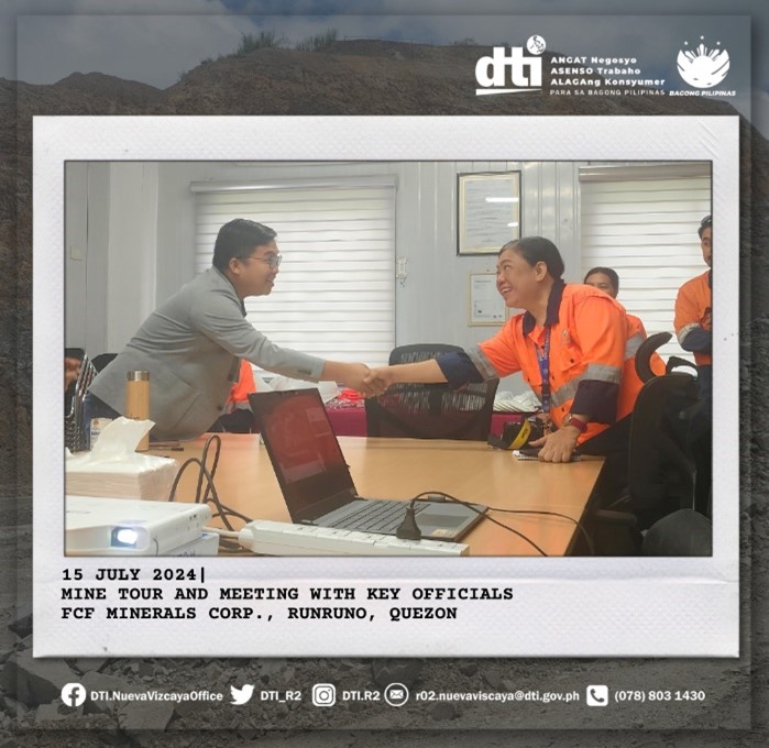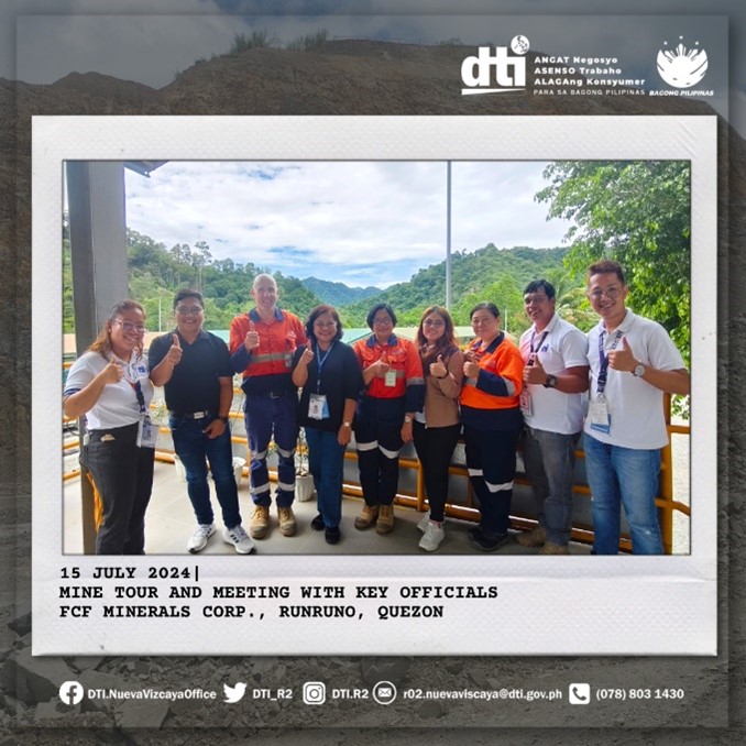 With the goal of strengthening the partnership between both organizations, Team DTI R2 Nueva Vizcaya led by Provincial Director Atty. Michael B. Paggabao visited FCF Minerals Corporation in Runruno, Quezon on 15 July 2024 to meet their key officials and have a mine tour.