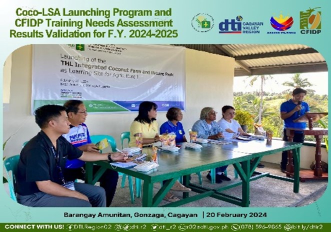 The Department of Trade and Industry (DTI) Region 2, Agricultural Training Institute – Regional Training Center 02 (ATI-RTC 02), Philippine Coconut Authority (PCA), and Local Government Unit (LGU) Gonzaga, supported the Coconut-based Learning Site for Agriculture (Coco-LSA) Launching Program and CFIDP Training Needs and Assessment Results Validation for FY 2024-2025 on 20 February 2024 at THL Integrated Farm, Brgy. Amunitan, Gonzaga, Cagayan.