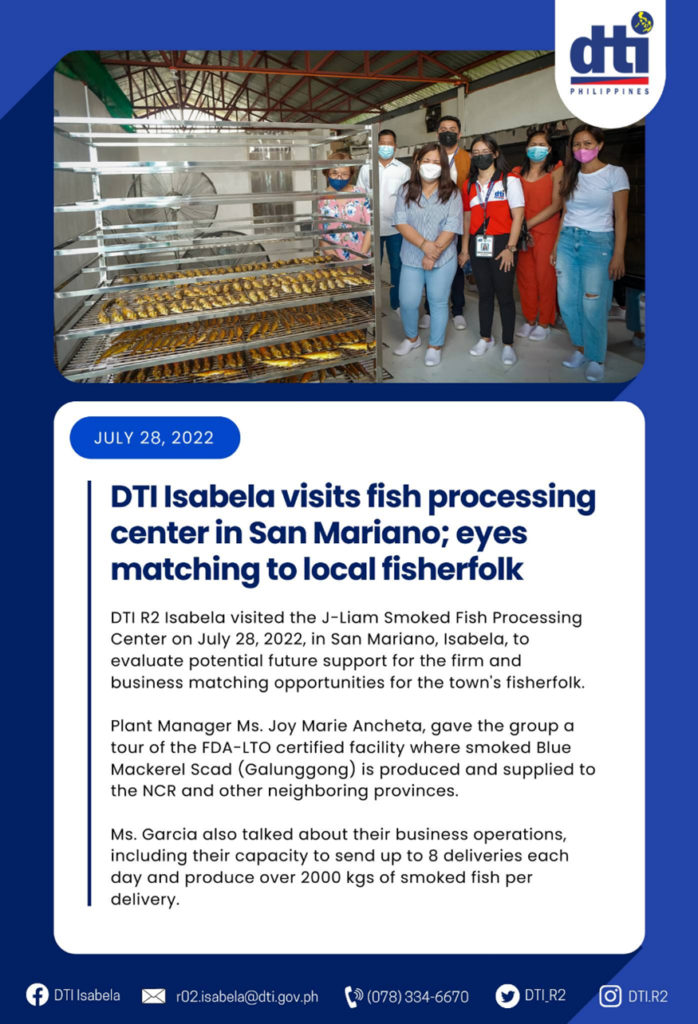 Department of Trade and Industry (DTI) Region 2 Isabela visited the J-Liam Smoked Fish Processing Center on 28 July 2022, in San Mariano, Isabela, to evaluate potential future support for the firm and business matching opportunities for the town’s fisherfolk.