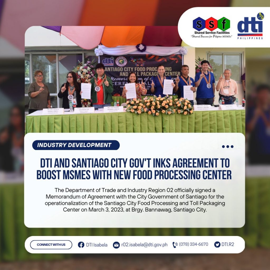 The signing was brought about by the establishment of the center as a primary processing center for MSMEs not only in Santiago City but in the whole of Region 2 and neighboring towns to process their products in a shared system through DTI’s Shared Service Facility Program.