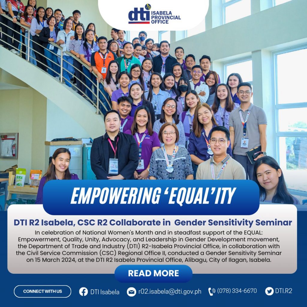 In celebration of National Women’s Month and in steadfast support of the EQUAL: Empowerment, Quality, Unity, Advocacy, and Leadership in Gender Development movement, the Department of Trade and Industry (DTI) R2-Isabela Provincial Office, in collaboration with the Civil Service Commission (CSC) Regional Office II, conducted a Gender Sensitivity Seminar on 15 March 2024, at the DTI R2 Isabela Provincial Office, Alibagu, City of Ilagan, Isabela.