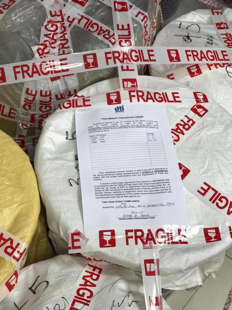 The Consumer Protection Division (CPD) of the Department of Trade and Industry Isabela Provincial Office (DTI-Isabela) seized uncertified and nonconforming products in Isabela province last 10 and 11 of June 2021. The CPD Enforcement Team inspected, sealed, confiscated, and withdrawn from five violating stores a total of 2,366 products with an estimated market value of P164,650.