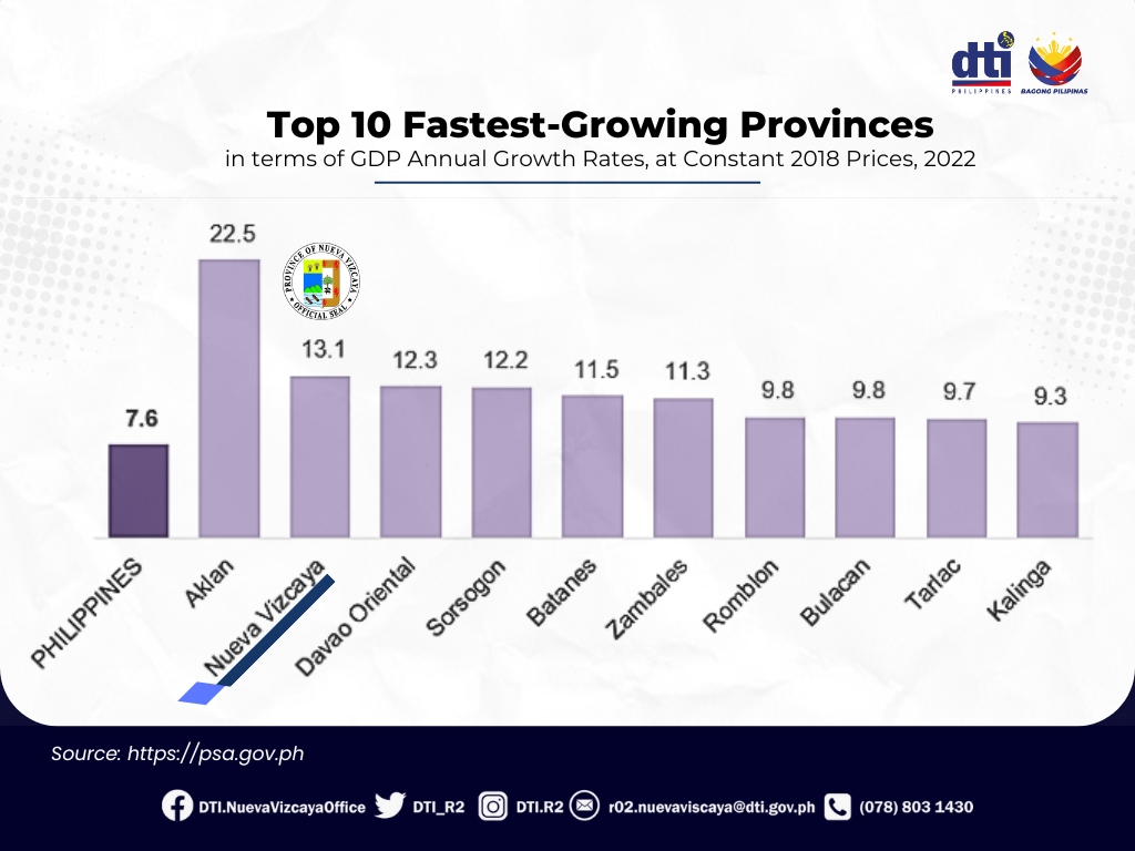 The Naturally Vibrant Province of Nueva Vizcaya continues to shine as it achieves yet another milestone, securing the 2nd spot in the list of the Top 10 Fastest Growing Provinces. This is based on the 2022 Economic Performance of the Provinces in the Philippines, as released by the Philippine Statistics Authority (PSA) on 19 February 2024.
