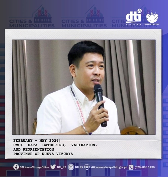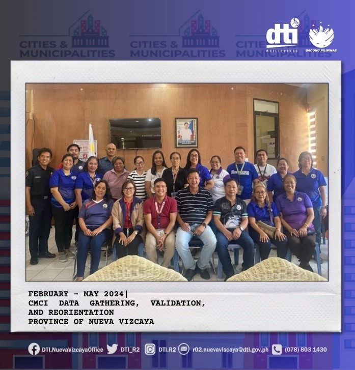 The DTI R2 Nueva Vizcaya Provincial Office bared on 10 May 2024 its 100% readiness for the 2024 Cities and Municipalities Competitiveness Index (CMCI) Survey after all of its 15 Municipal Local Government Units achieved a 100% progress rate in the data gathering and uploading.