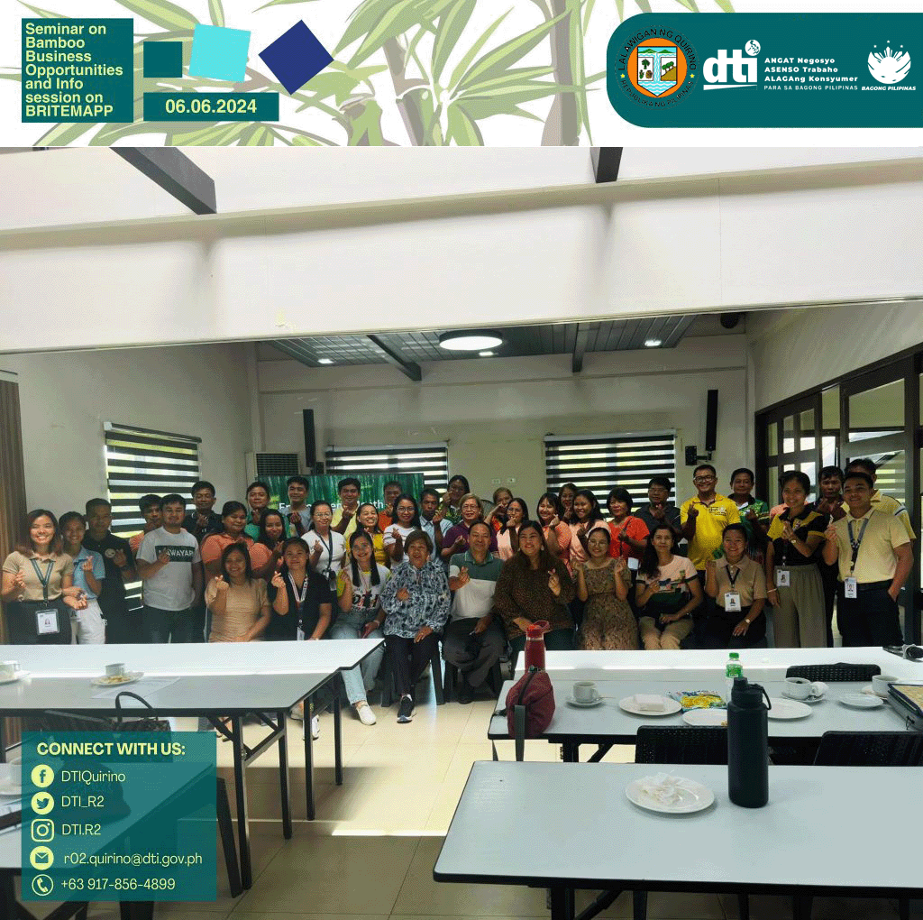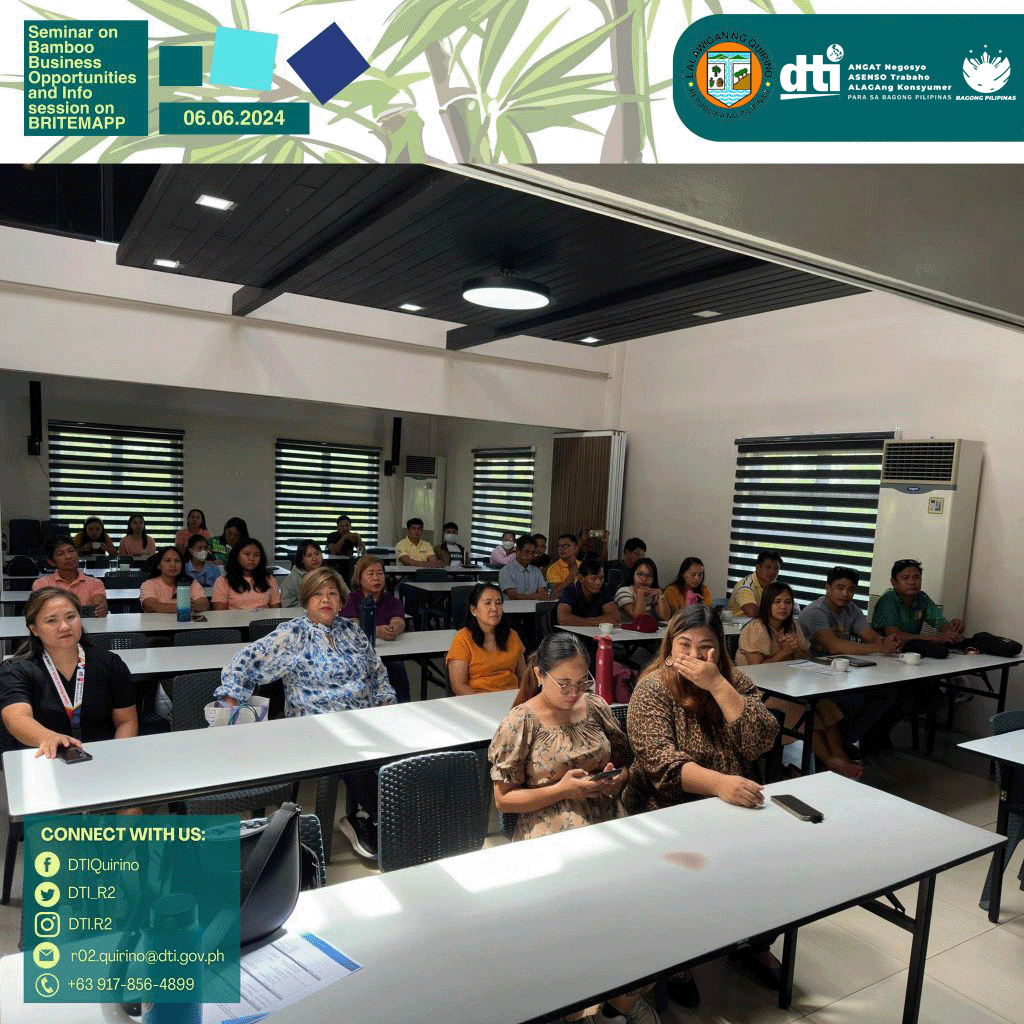 Cabarroguis, Quirino — The Department of Trade and Industry (DTI) R2 – Quirino and the Provincial Natural Resources and Environment Office (PNREO) of the Province of Quirino, conducted the “Seminar on Business Opportunities in the Bamboo Industry and Info Session on Bamboo Resources Inventory” on June 6, 2024, held at Quirino Watersports Complex, Capitol Hills, Cabarroguis, Quirino.
