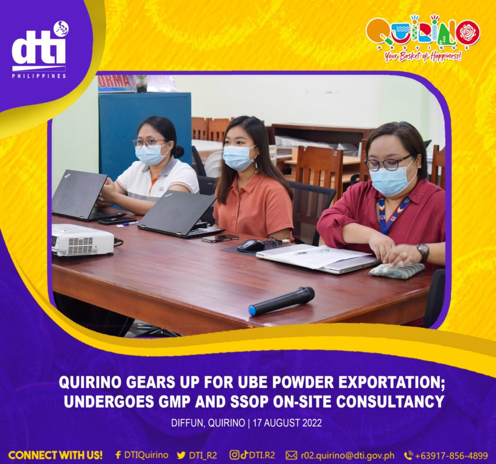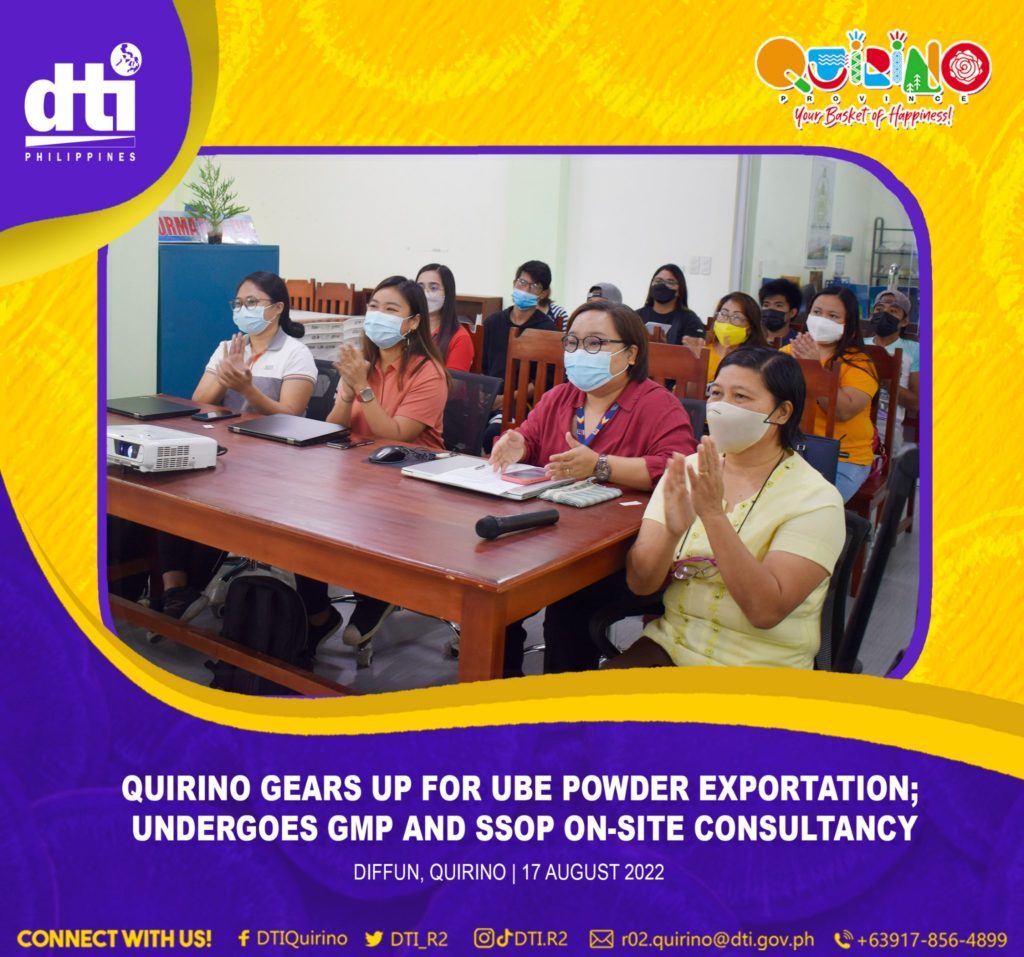The DTI Regional Office 2 through DTI R2 Quirino Provincial Office commenced today, 17 August 2022 its three-day On-site Consultancy on Good Manufacturing Practices (GMP) and Standard Sanitation Operating Procedures (SSOP) at the Quirino Young Entrepreneurs Association (QYEA) Processing Center, Quirino State University, Diffun, Quirino.