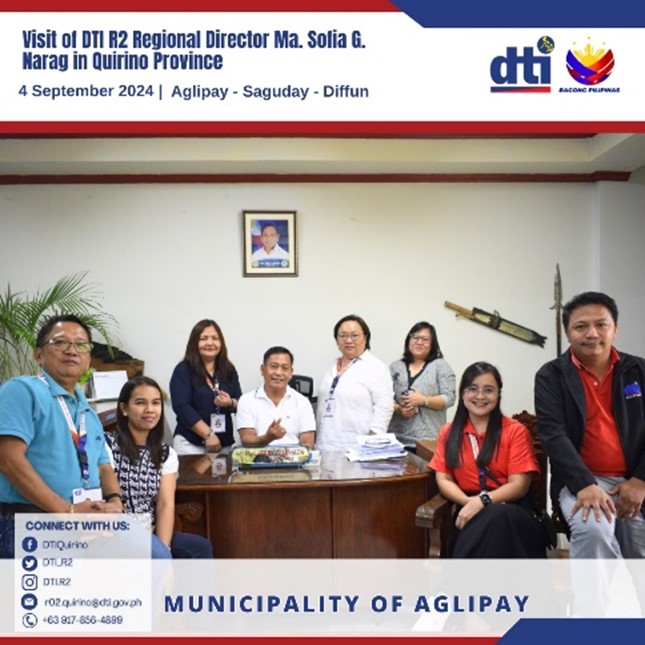 The new Department of Trade and Industry (DTI) R2 Regional Director, Ma. Sofia G. Narag, CESO V, reconnected with the leaders and industry stakeholders in Quirino Province. On 4 September 2024, she met with Mayor May Garnace Calaunan, Mayor Jerry Pagbilao, and Mayor Jerry Agsalda of the municipalities of Diffun, Saguday, and Aglipay respectively.