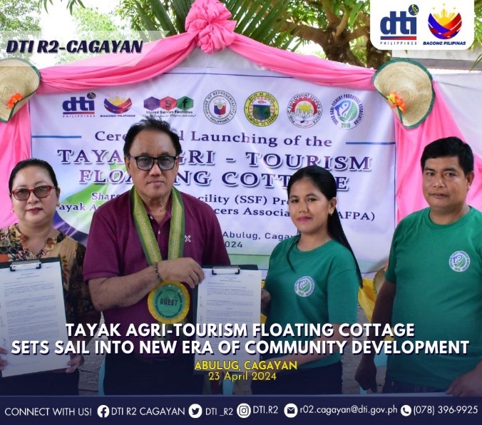 This cheerful chant signified a momentous occasion as the Department of Trade and Industry R2 Cagayan, together with the Office of Congresswoman Hon. Baby Aline Vargas Alfonso and the Local Government Unit (LGU) of Abulug led by Hon. Mayor Jesus Emmanuel P. Vargas, officially launched the Tayak Agri-Tourism Floating Cottage Facility of the Tayak Agri-Fishery Producers Association (TAFPA) on 23 April 2024, at Sitio Tayak Barangay Siguiran, Abulug, Cagayan.