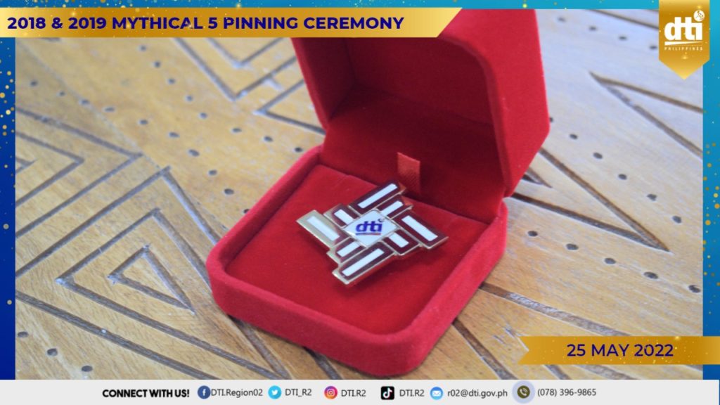 Out of a hundred employees of the Department of Trade and Industry (DTI) Region 2, ten employees were recognized in the recently concluded DTI Mythical 5 Pinning Ceremony for 2018 and 2019 on 25 May 2022.