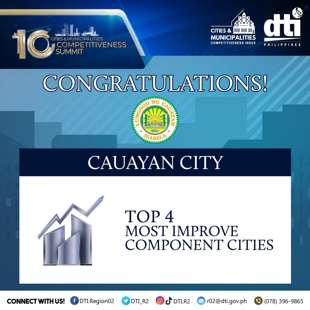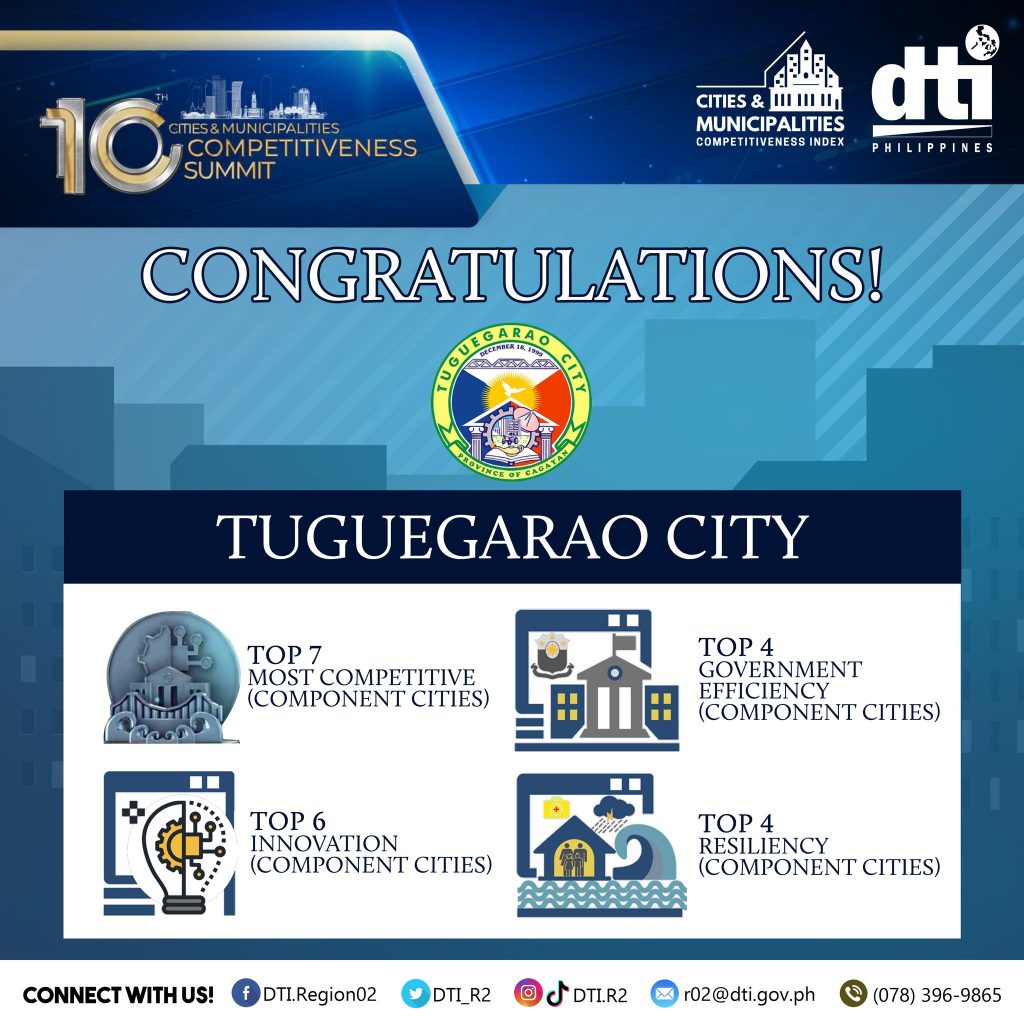 Tuguegarao City, Cagayan was hailed as Top 7 Over-all Most Competitive under the Component Cities category and Cauayan City, Isabela have been recognized as Top 4 Most Improved under the Component Cities category.