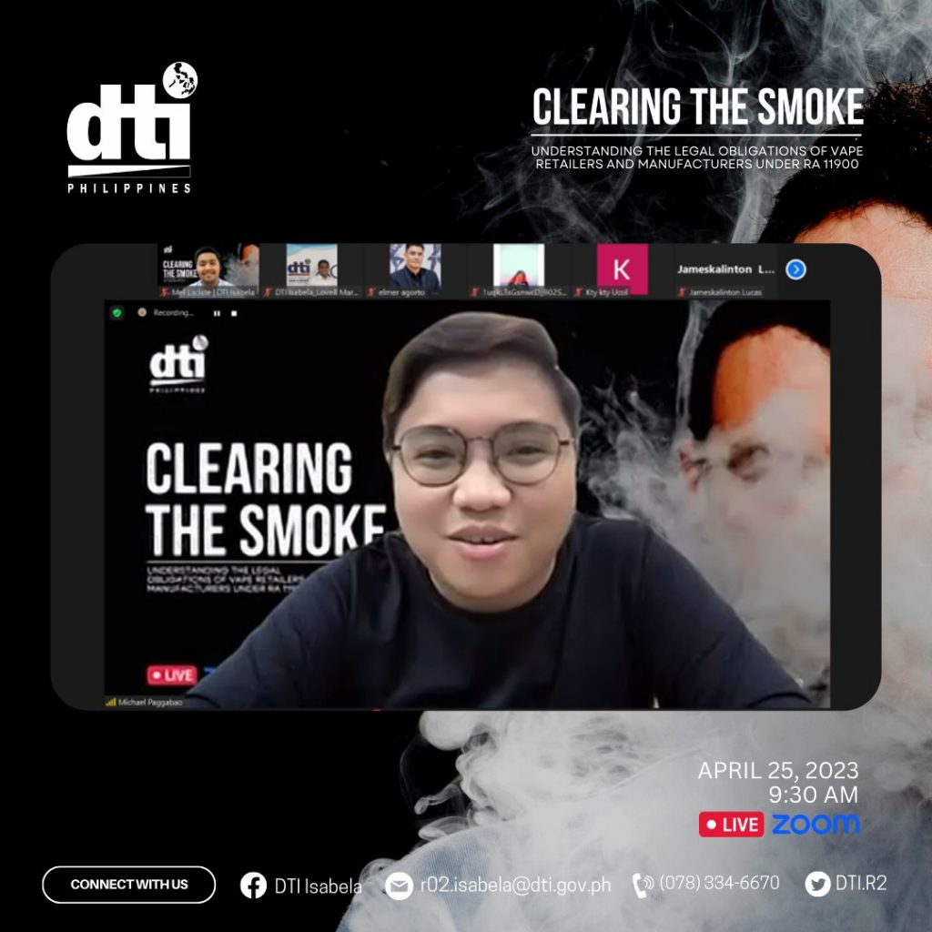 ISABELA — On April 25, 2023, the Department of Trade and Industry (DTI) Isabela held a webinar via Zoom entitled “Clearing the Smoke: Understanding the Legal Obligations of Vape Retailers and Manufacturers under RA 11900.” The objective of the webinar was to educate retailers, manufacturers, and importers of vaporized nicotine and non-nicotine products about the newly issued Republic Act No. 11900 or the Vaporized Nicotine and Non-Nicotine Products Regulation Act.