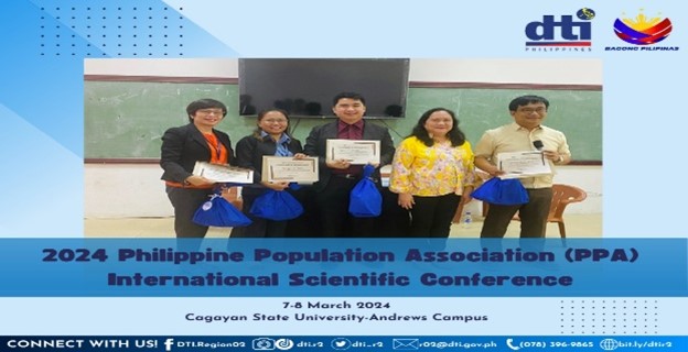 The Department of Trade and Industry (DTI) Region 2 assisted the top three (3) winning papers in the 2023 Cities Municipalities Competitiveness Index (CMCI) Research Conference in their paper presentation during the 2024 Philippine Population Association International Scientific Conference (PPAISC) last 7 March 2024 at the Cagayan State University-Andrews Campus, Tuguegarao City.