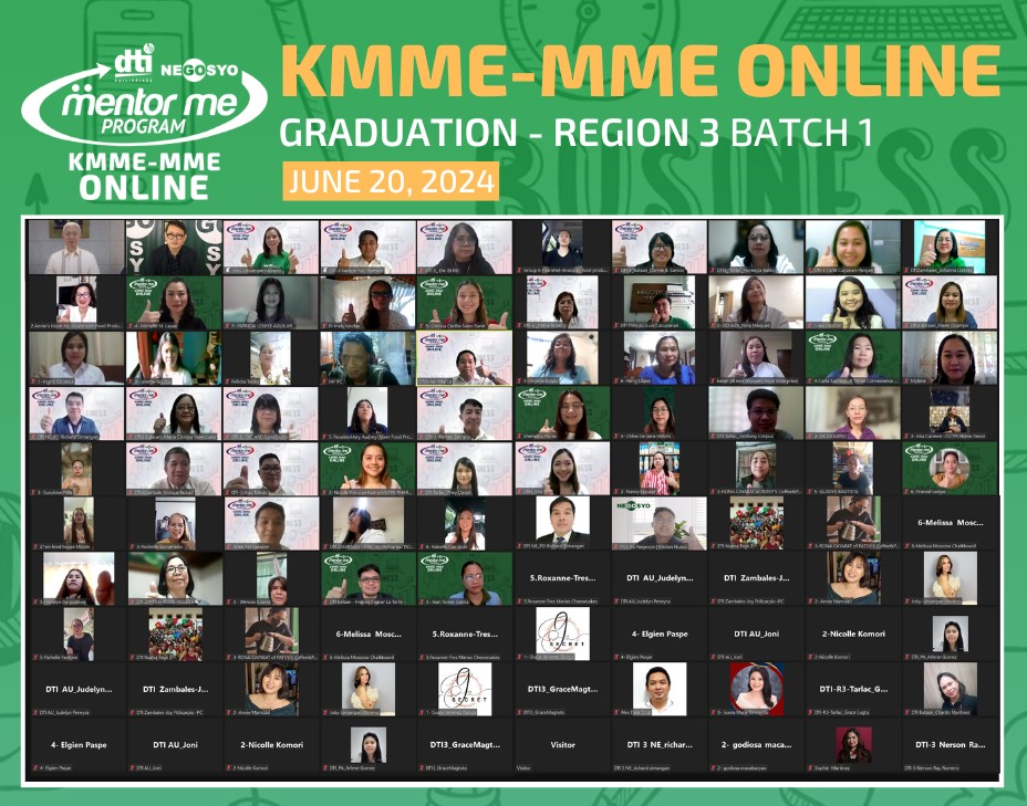 Forty-eight (48) women entrepreneurs recently completed the Kapatid Mentor Me Money Market Encounter (KMME-MME) business mentorship training program provided by the Department of Trade and Industry – Region 3 (DTI-3), and Philippine Center for Entrepreneurship (PCE) – Go Negosyo. The graduation ceremony of the program was virtually held last June 20, 2024 via Zoom conference.