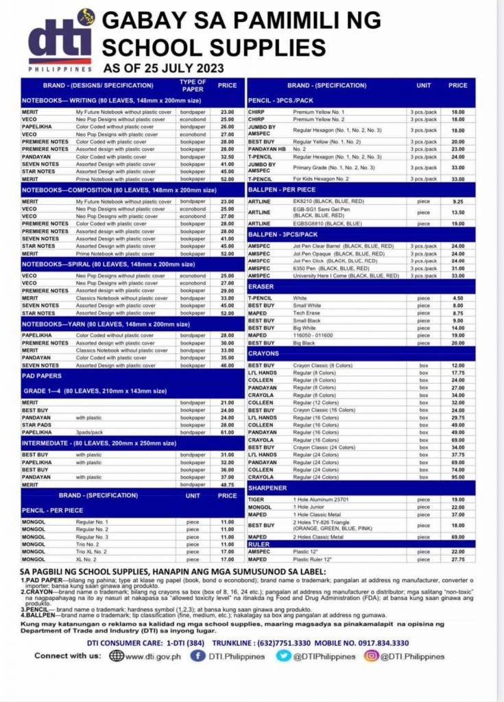The “Gabay sa Pamimili ng School Supplies” includes a wide range of essential school supplies, such as notebooks, pad papers, pencils, ballpoint pens, crayons, erasers, sharpeners, and rulers. By providing specific brands and corresponding prices, the guide empowers parents and students to plan their back-to-school shopping more efficiently.
