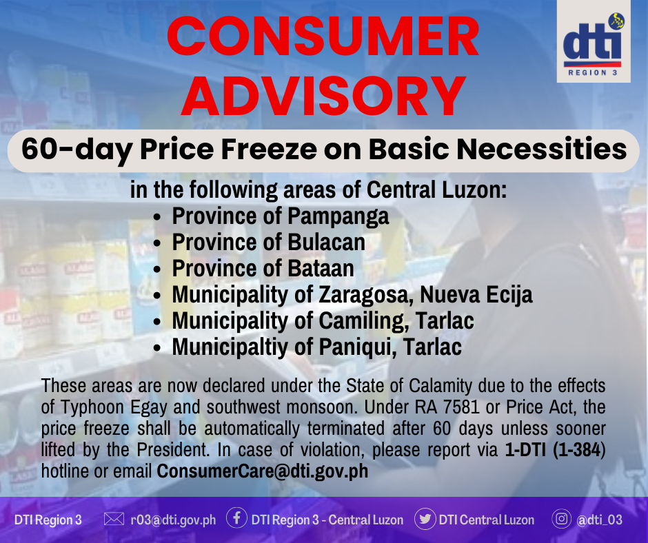 A price freeze on basic necessities is now in effect in select areas in Central Luzon which were placed under a State of Calamity. This is in response to the recent calamitous events caused by the southwest monsoon and Typhoon Egay in Central Luzon.