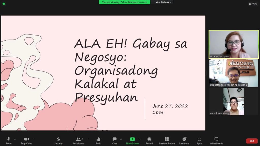 The new title was first introduced to the public last 11 April 2022, during the Livelihood Seeding Program – Negosyo Serbisyo sa Barangay (LSP-NSB) beneficiary webinar entitled “ALA E! Asenso pag Determinado: Kaalaman at Kwarta” a two-part webinar program about entrepreneurial mind setting and financial management, a total of 106 participants from various municipalities of Batangas province attended the said webinar via Zoom Meeting. At present, a total of nine (9) ALA E! webinars have already been conducted with over 600 participants provincewide.