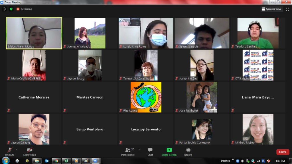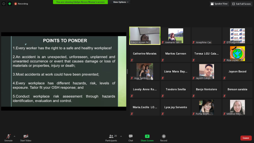 Pila, Laguna — To continuously provide its information and advocacy services to micro, small, and medium enterprises (MSMEs), the Department of Trade and Industry – Laguna Provincial Office (DTI-Laguna) through the Negosyo Center Pila conducted a webinar on Basic Occupational Safety and Health via the Zoom conferencing platform last 19 March 2021. The webinar was attended by 22 potential and existing MSMEs.