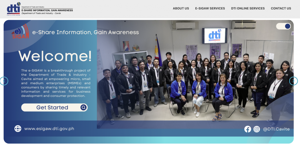 Through the funding of the DTI-Bureau of Small and Medium Enterprise Development (BSMED) in 2021, e-SIGAW serves as a platform for DTI Cavite to empower the micro, small and medium enterprises (MSMEs) and consumers by sharing timely and relevant information for the development of businesses and protection of consumers. In 2022, the DTI Cavite was tasked a more extensive implementation of the e-SIGAW project with a focus on website development to provide organized and retrievable information for its clients.