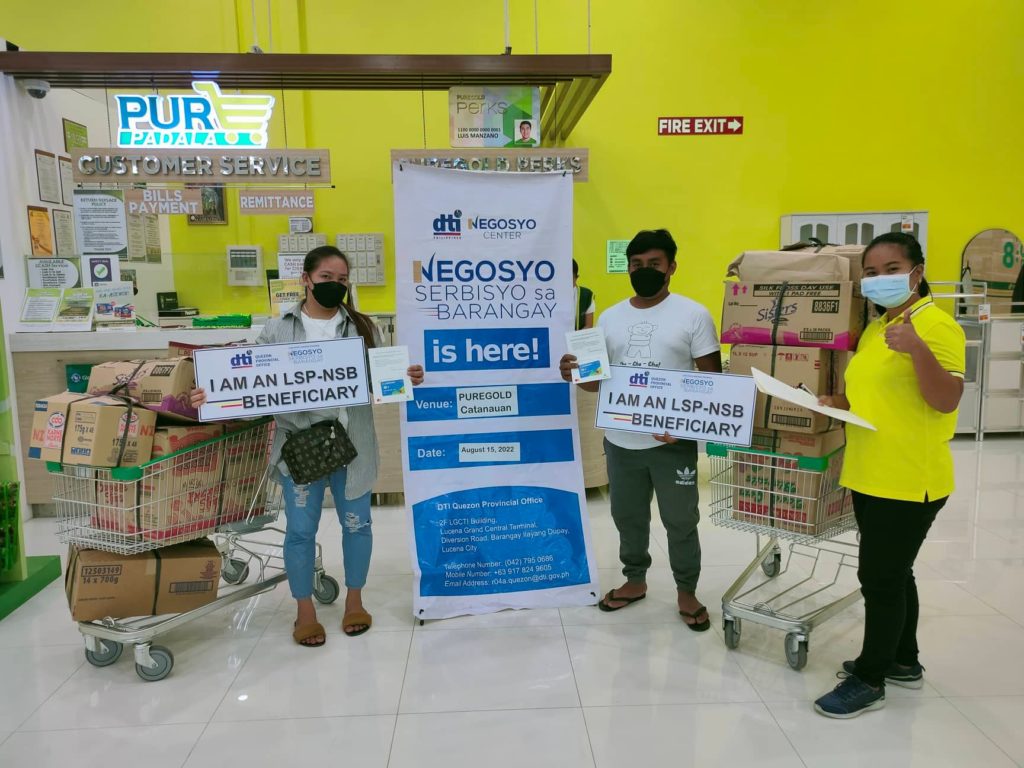 The Department of Trade and Industry (DTI) Quezon, through Negosyo Center Catanauan, conducted the awarding of business kits for the Livelihood Seeding Program – Negosyo Serbisyo sa Barangay (LSP-NSB) beneficiaries of Catanauan, Quezon. This was held at Puregold Catanauan on August 15, 2022. The event was attended by the beneficiaries from Barangay San Roque and Barangay Tagabas Ibaba, Catanauan, Quezon.