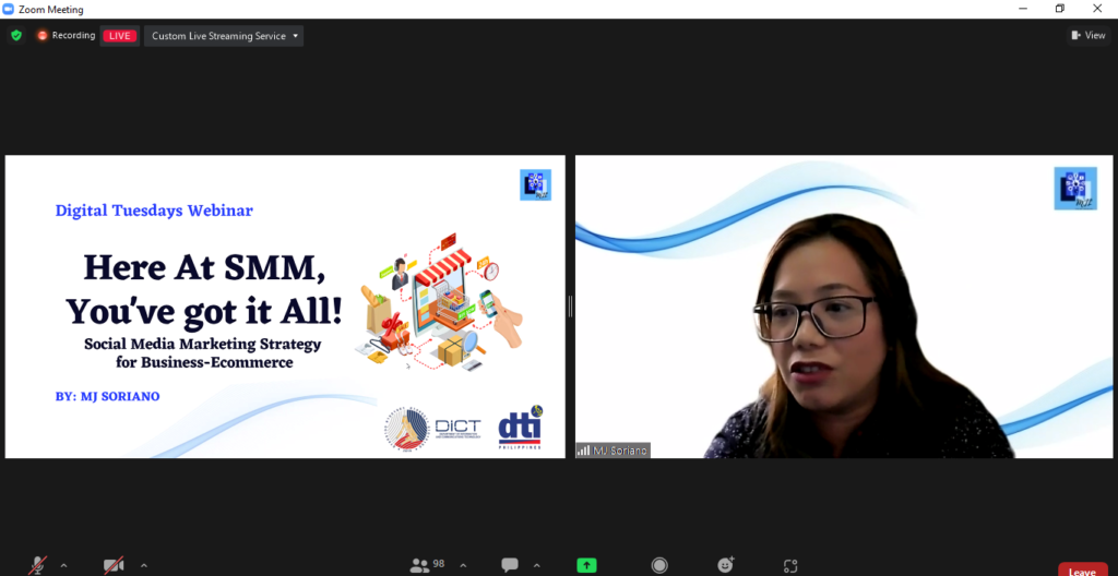 Ms. Maria Jamaica C. Soriano, Proprietor of MJL Online Services and co-founder of MVJ Training Consultancy Services, discussed the topic on “Here at SMM, You’ve Got It All!”. Her presentation focused on e-commerce and the utilization of social media as marketing means for MSMEs. She also shared essential social media e-commerce strategies to help build brand identity and generate more sales.