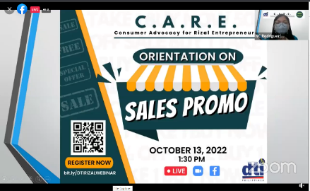 The Department of Trade and Industry – Rizal Provincial Office conducted a webinar on Consumer Advocacy for Rizal Entrepreneurs (CARE): Orientation on Sales Promo last October 13, 2022, facilitated by Ms. Grace Masilongan, Negosyo Center Rodriguez Business Counselor. This CARE webinar is initiated by the DTI Rizal to encourage micro, small and medium entrepreneurs to boost their marketing strategy through the proper conduct of sales promotion.