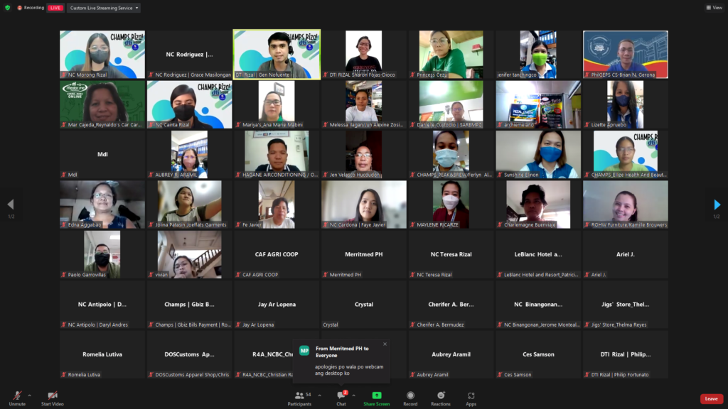 As part of the Collaborative Harnessing Assistance and Mentoring for SMEs (CHAMPS) Season 3 module, the Department of Trade and Industry (DTI) Rizal conducted a webinar with the Philippine Government Electronic Procurement System (PhilGEPS). The Multi-sectoral module entitled “Entering Government Contracts through PhilGEPS”, which was attended by the program beneficiaries and other invited entrepreneurs from the different municipalities in Rizal Province, was hosted by Negosyo Center Morong Business Counselor Ms. Ara Elaine Suazo.