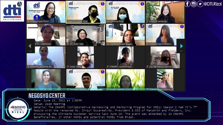 One of the CHAMPS Modules focused on ultimate customer service was conducted on 23 June 2021 and was attended by the 24 CHAMPS enrollees and 27 other MSMEs from the province of Rizal. In behalf of Provincial Director Desiderio Jurado III, Chief Trade Industry Development Specialist (CTIDS) Sharon F. Dioco welcomed the participants and shared how customer service seemed to be a hot topic for entrepreneurs as evidenced by the number of registrants, showing how eager they are to provide exceptional service. She stated how first-rate customer experience is key in sustaining and growing a business.