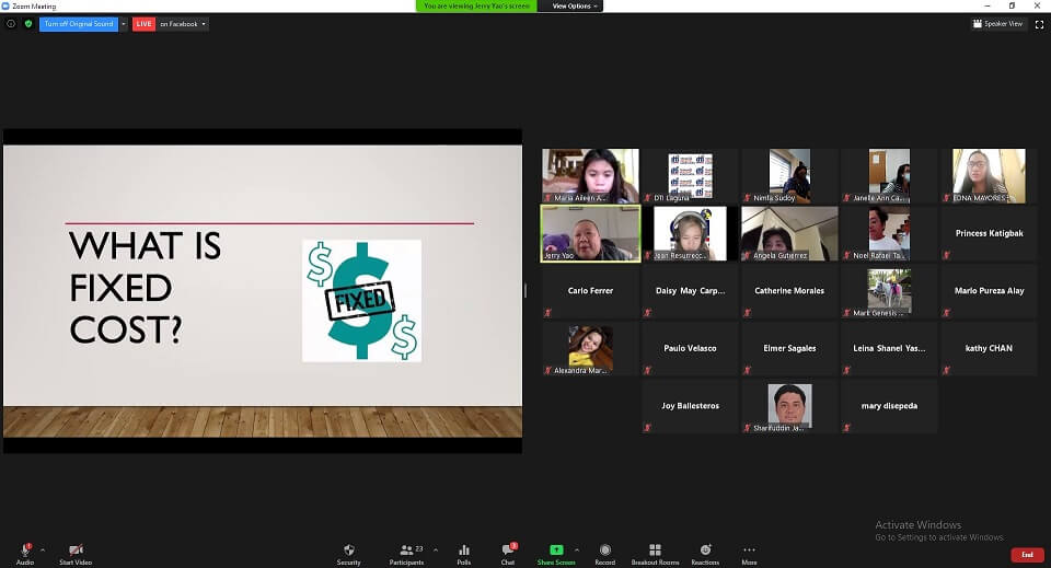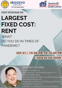 Fixed costs are the bills that the business has to pay no matter what. Even if the firm has shut down, closed premises or stopped serving customers, it will likely still be facing these kinds of costs. The said webinar tackled to control the fixed costs during the coronavirus (COVID-19) outbreak and strategies that are needed to make the difference to the survival of the business. Moreover, the event was facilitated by DTI-Laguna Negosyo Center Business Counselor Jean S. Resurreccion and LGU-designated Negosyo Center Staff, Ms. Aileen Abanes, Ms. Kate Katigbak and Mr. Janmartin Almodovar, together with Mr. Jerry Cocabo Yao, known as “The Marketing Sensei”, as the resource speaker. A total of thirty (30) participants attended the said event. ♦