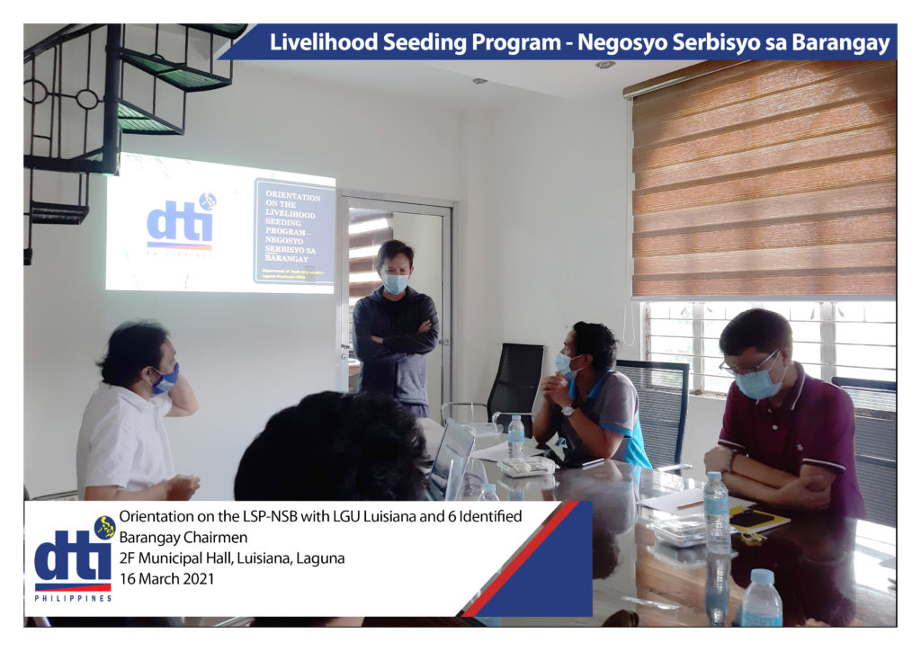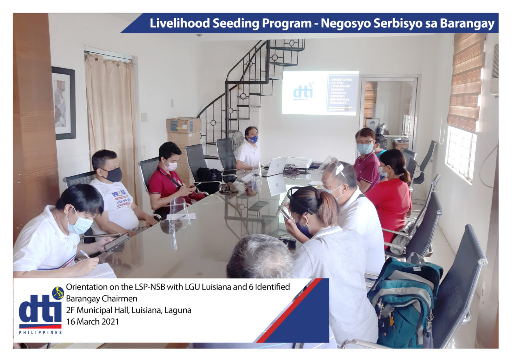 LUISIANA, Laguna — On 16 March 2021, the Department of Trade and Industry – Laguna Provincial Office together with Negosyo Center Luisiana facilitated an orientation with the Local Government Unit (LGU) of Luisiana regarding the implementation of the Department’s Livelihood Seeding Program – Negosyo Serbisyo sa Barangay (LSP-NSB).