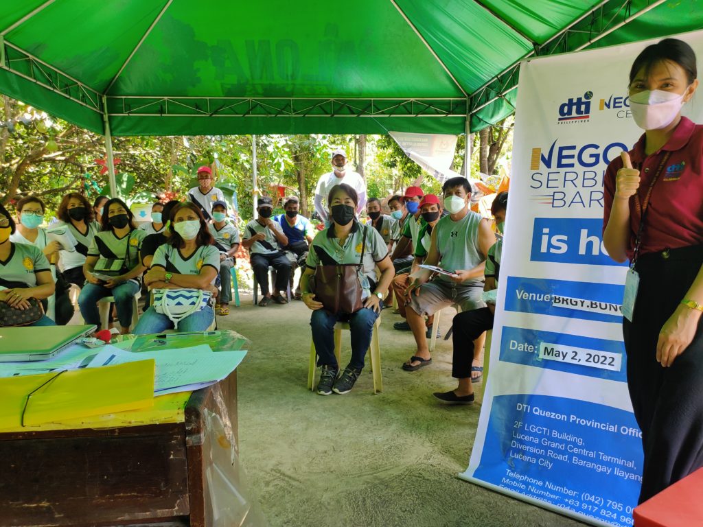 The Department of Trade and Industry (DTI) Quezon, through Negosyo Center Dolores, in cooperation with the local government unit (LGU) Dolores and in partnership with the Barangay LGU headed by the Barangay Captain of Bungoy, Hon. Alfonso K. Santos, and the Barangay Captain of Silanganan, Hon. Oscar L. Montierro, conducted the Livelihood Seeding Program — Negosyo Serbisyo sa Barangay (LSP-NSB) last 2 May 2022 and 21 May 2022 in Barangay Bungoy and Barangay Silanganan, Dolores, Quezon. The aim of the said program is to provide wider business development assistance by bringing government services closer to the people through partnerships between relevant local government units and DTI officials.