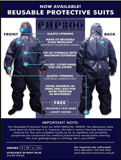 “We started making washable facemasks mid-March and reusable protective suits in early April this year,” Quilantang added.