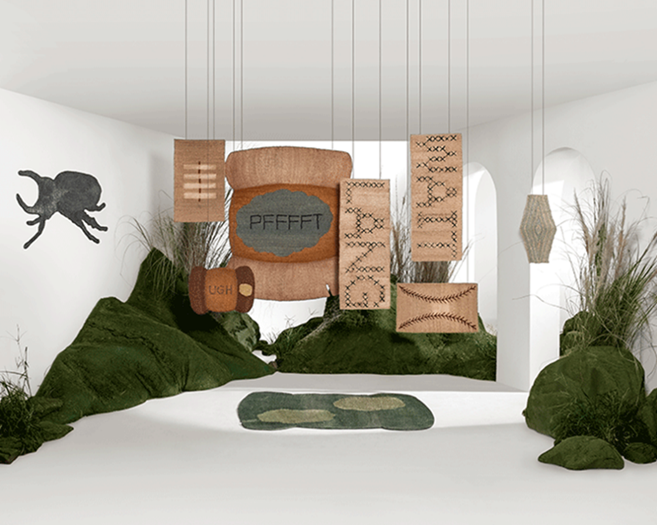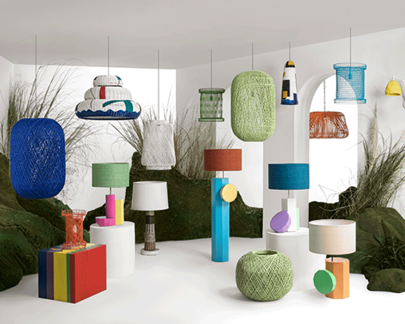 The results: organic shapes with a lively bent that address form and function. A thimble as an accent stool? Abaca welcome rugs with witty greetings? Pendant lights that mimic spools of thread? These are just a few examples of the unique creations that could brighten up any home.