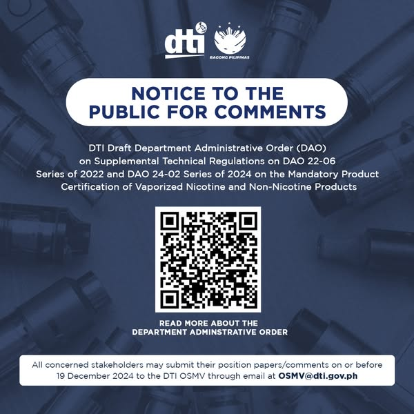 The Department of Trade and Industry (DTI) invites stakeholders to provide comments on the Draft Department Administrative Order (DAO) regarding Supplemental Technical Regulations on DAO 22-06 of 2022 and DAO 24-02 of 2024 on the Mandatory Product Certification of Vaporized Nicotine and Non-Nicotine Products.