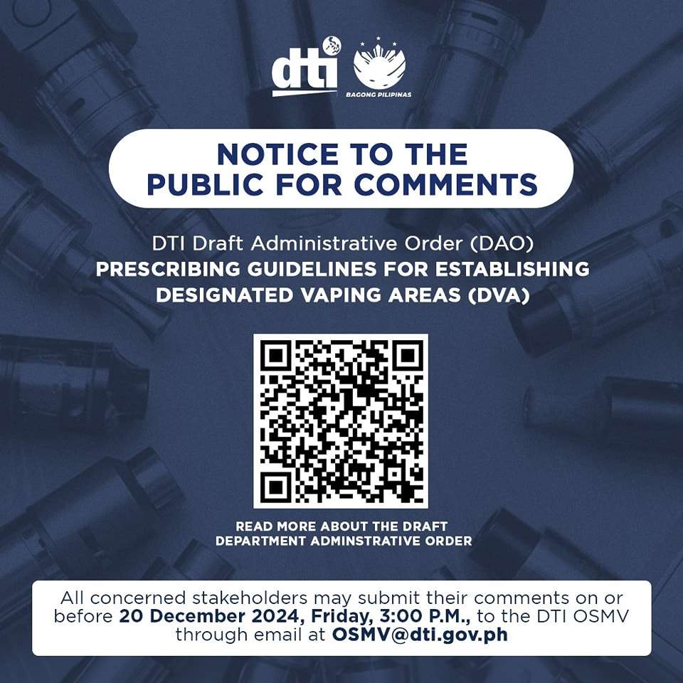 The Department of Trade and Industry (DTI) invites stakeholders to provide comments on the DRAFT DEPARTMENT ADMINISTRATIVE ORDER (DAO) on PRESCRIBING GUIDELINES FOR ESTABLISHING DESIGNATED VAPING AREAS (DVA).