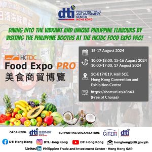 September 09, 2024Hong Kong – The Department of Trade and Industry (DTI) through its trade promotion office in Hong Kong, the Philippine Trade and Investment Center – Hong Kong (PTIC-HK), in collaboration with the Center for International Trade Expositions and Missions (CITEM) and the Philippine Consulate General in Hong Kong (PCGHK), participates…Read More