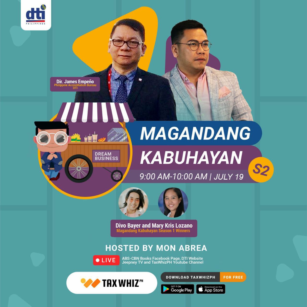 Magandang Kabuhayan is hosted by Mr. Mon Abrea and airs every Monday in partnership with DTI Philippines, Asian Consulting Group – ACG and powered by Tax Whiz PH Digital Solutions. It is streamed from 9:00 AM to 10:00 AM, live via ABS-CBN Books Facebook Page, TaxWhizPH, and JeepneyTV Youtube Channel, and simulcast at DTI Website.