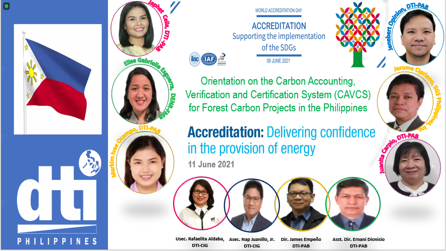 Three distinguished speakers were invited to share their expertise on different topics highlighting the role and impact of accreditation and CAVCS. Ms. Japhet Celis of DTI-PAB discussed the, “Overview of the Philippine Accreditation Bureau;” Ms. Elise Gabrielle Esguerra from Department of Environment and Natural Resources – Forest Management Bureau (DENR-FMB) presented the “Overview on Process Flow, Forest Carbon Accounting, Monitoring and Reporting, Validation and Verification of CAVCS for Forest Carbon Projects in the Philippines;” and Ms. Markim Ivee Ocampo also of DTI-PAB, presented the “Accreditation of GHG Validation and Verification Bodies”.
