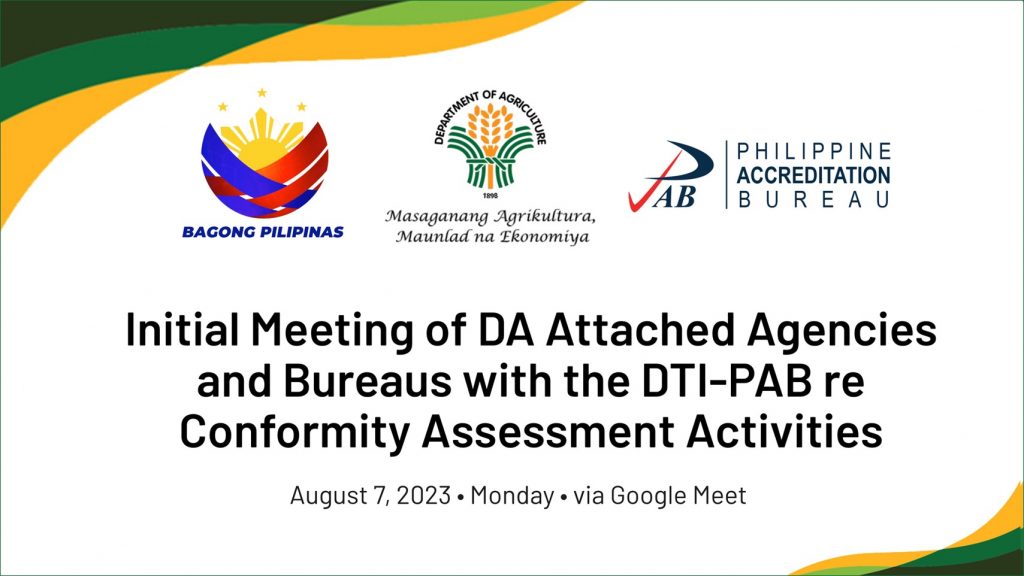 On August 7, 2023, the Department of Trade and Industry – Philippine Accreditation Bureau (DTI-PAB) and the Department of Agriculture (DA), through the Office of Dr. Mercedita A. Sombilla, Undersecretary for Policy, Planning, and Regulations, met with various offices and bureaus of DA. The primary objective of the meeting was to explore potential collaborations with DA offices involved in conformity assessment functions or those utilizing conformity assessment services.