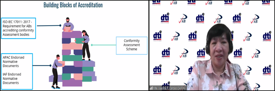 On the other hand, DTI-PAB is the national accreditation body, mandated to accredit certification and inspection bodies, testing including medical, and calibration laboratories, and other bodies offering conformity assessment services. PAB is a signatory to the Multilateral Recognition Arrangement (MLA) for Quality Management System (QMS) and Environmental Management System (EMS) of Asia Pacific Accreditation Cooperation (APAC) and International Accreditation Forum (IAF), and to the Mutual Recognition Arrangement (MRA) for testing, calibration, medical and inspection bodies of APAC and International Laboratory Accreditation Cooperation (ILAC).