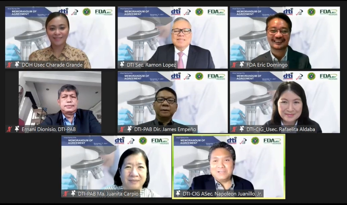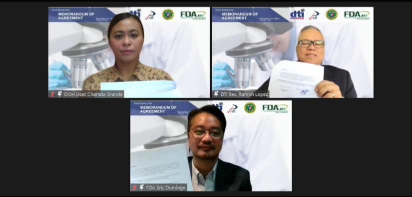 On 17 November 2021, DTI Secretary Ramon M. Lopez, DOH Undersecretary Charade B. Mercado-Grande, representing Secretary Francisco Duque III, and FDA Director General Rolando Enrique D. Domingo, simultaneously signed the agreement that would streamline the processes among PAB, the agencies under DOH, and FDA that are involved in the conformity assessments for laboratories, inspection bodies and similar organizations.