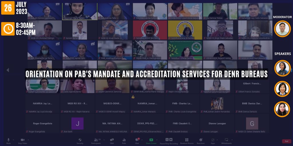 On July 26, 2023, the Department of Trade and Industry’s Philippine Accreditation Bureau (DTI-PAB) conducted a virtual briefing via Zoom for the personnel of the Department of Environment and Natural Resources (DENR). The session was attended by 54 personnel representing different Bureaus of DENR, marking a collaborative effort to enhance the quality of conformity assessment activities provided to the public.
