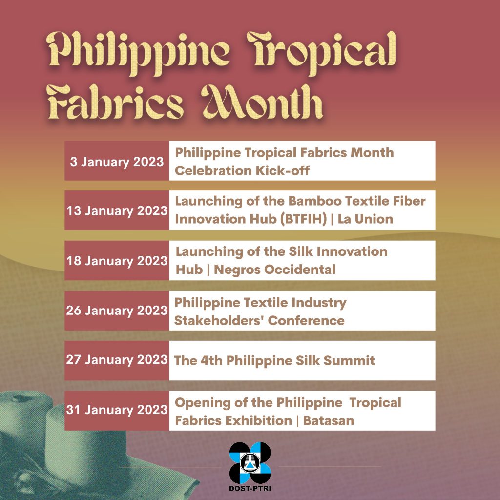 With this year’s theme, “Pushing Boundaries for Sustainable, Competitive, and Inclusive Philippine Textile-Garment Industry,” DOST-PTRI celebrates key milestones. They will also launch innovation hubs and raise awareness in using and developing Philippine textiles, local natural resources, and mainstream developed textile solutions and technologies, among others.